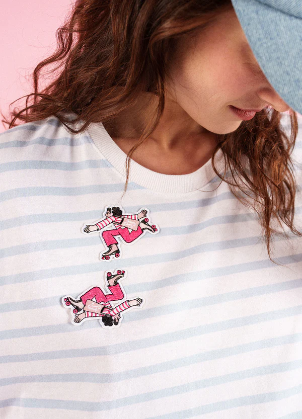 Personnalisez votre marinière SAINT JAMES avec un écusson thermocollant représentant une femme à roller. Son design vintage et coloré ajoutera une touche originale à vos rayures intemporelles.