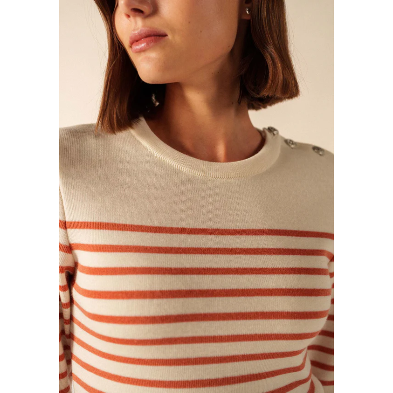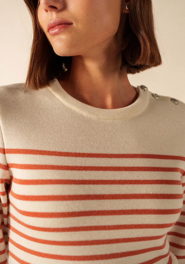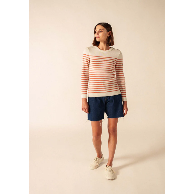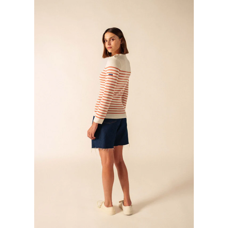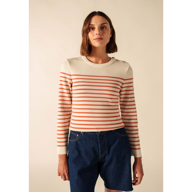 Pièce incontournable du vestiaire féminin SAINT JAMES, le pull Marée est une version féminine de notre iconique pull marin. Tricoté dans nos ateliers avec une laine douce et fine, il est idéal pour celles recherchant confort, chaleur et élégance. Intemporel, il reprend les codes centenaires des pulls marins : un col rond remaillé, un tricotage en côte 1x1, un boutonnage sur une épaule, une composition 100% laine et une coupe ajustée pour conserver chaleur et praticité. Versatile, il devient le compagnon parfait de toutes vos tenues, qu’elles soient habillées ou casual, classiques ou originales.