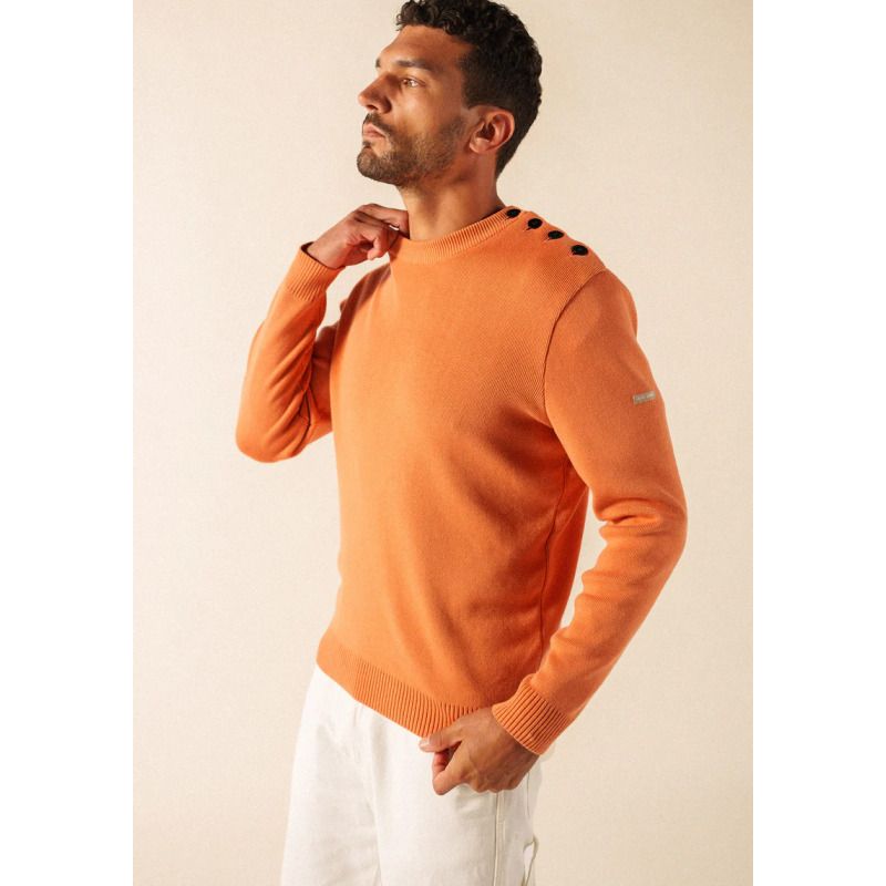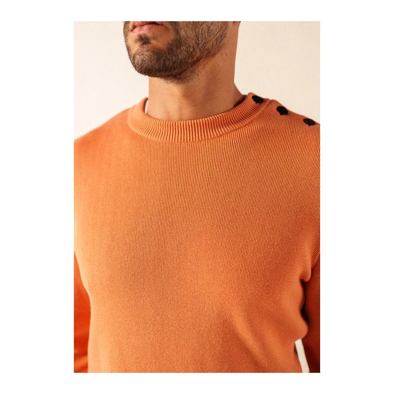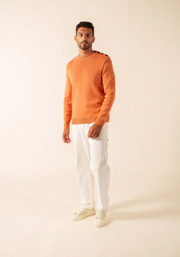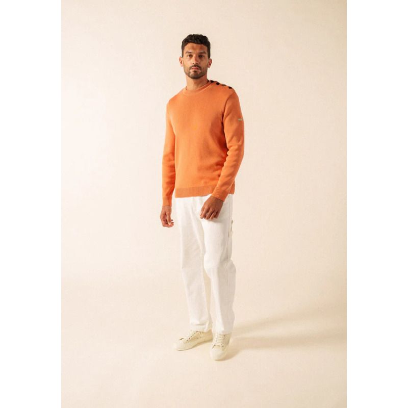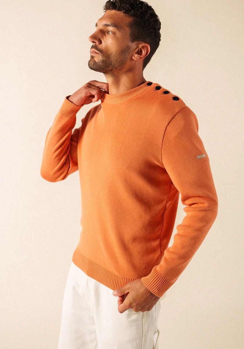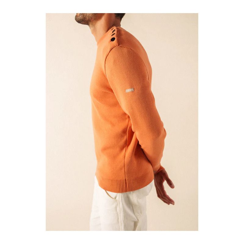 Il conserve les détails emblématiques du pull marin SAINT JAMES : une maille en côte 1x1, un col rond remaillé et un boutonnage sur une épaule, signature du style marin. Sa coupe confort et ses bord-côtes aux manches et au bas du vêtement assurent un port agréable au quotidien, tandis que le logo appliqué sur la manche gauche signe l’authenticité de la pièce.