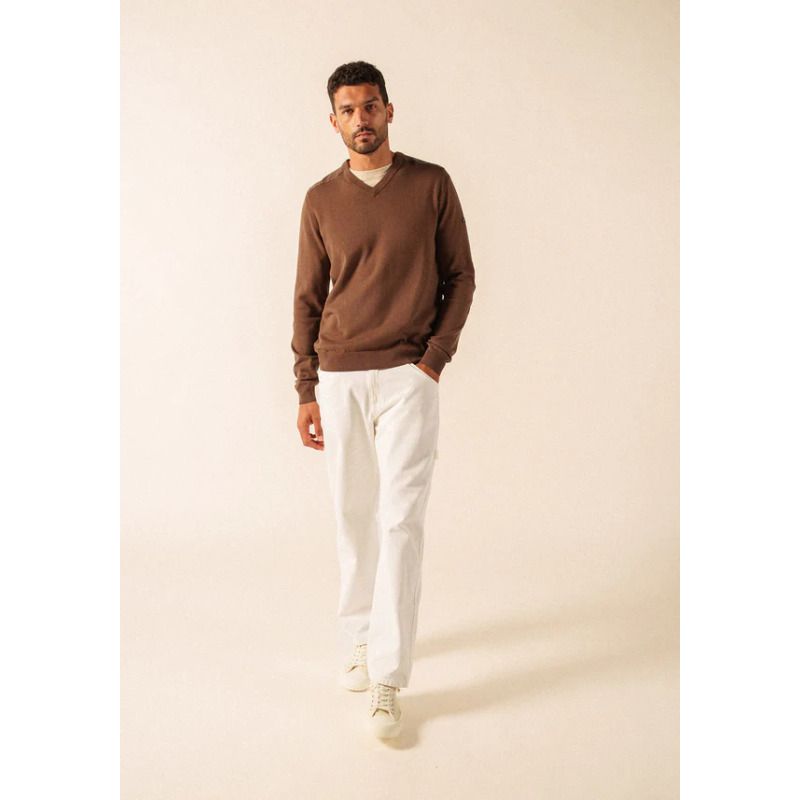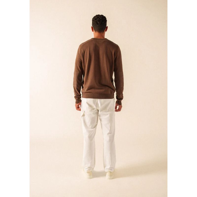 Le pull Trevise se réinvente tout en conservant son style classique grâce aux apports en toile ton/ton aux coudes et aux épaules. Il adopte un col V qui dégage élégamment le cou et permet de le porter facilement sur une chemise.