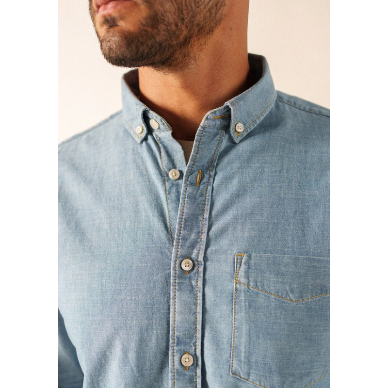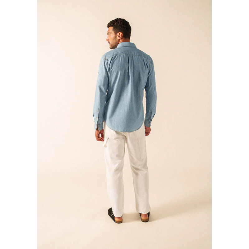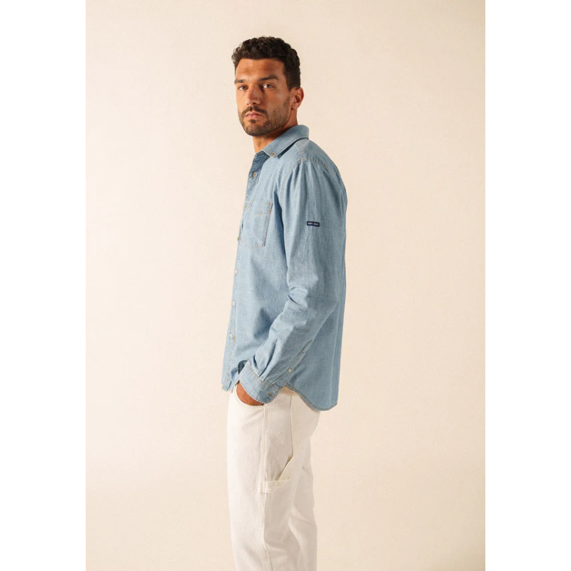 Il existe des matières qui incarnent parfaitement une saison, et le chambray en fait partie. Avec son aspect proche du denim mais sans la lourdeur, il apporte une touche à la fois légère et authentique. La chemise Donovan est confectionnée dans cette toile de coton douce et agréable à porter, idéale au quotidien.