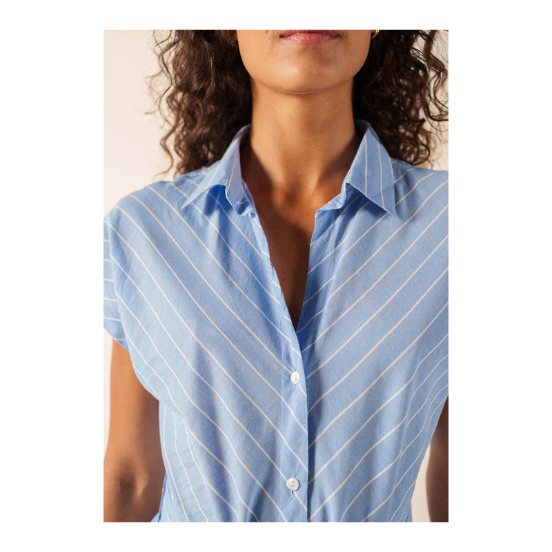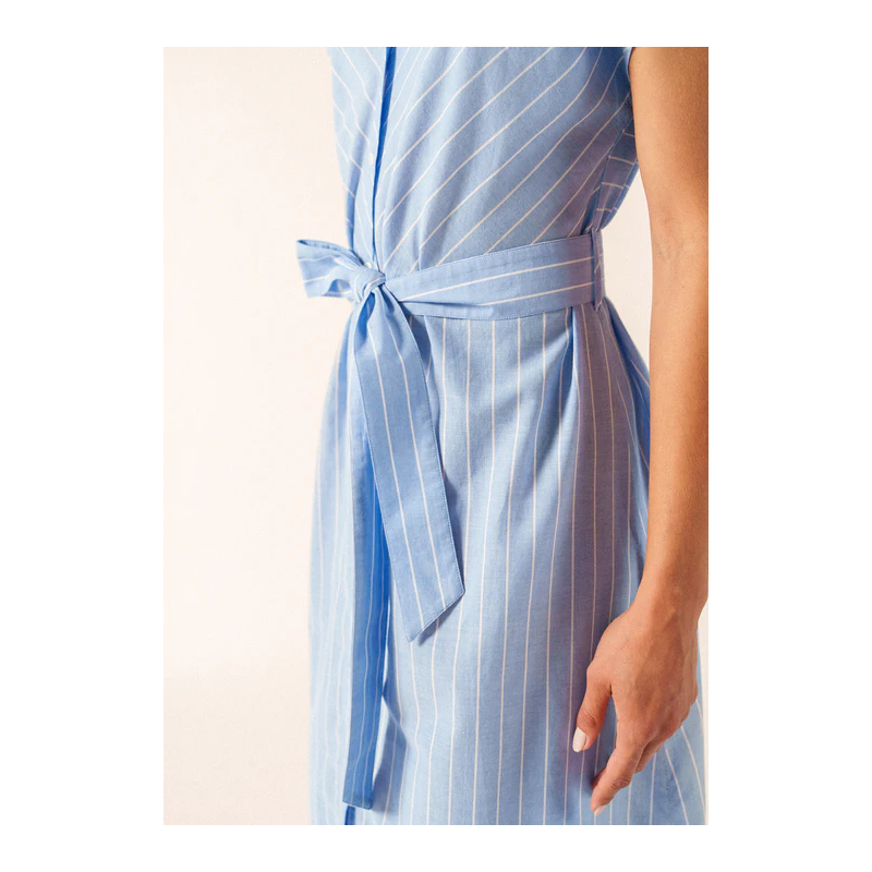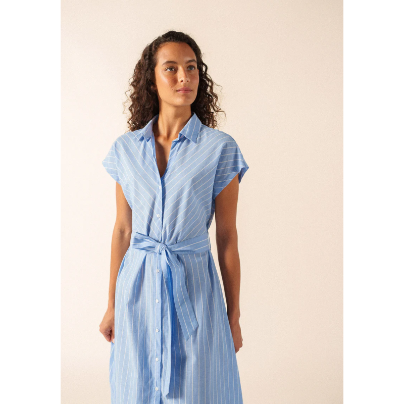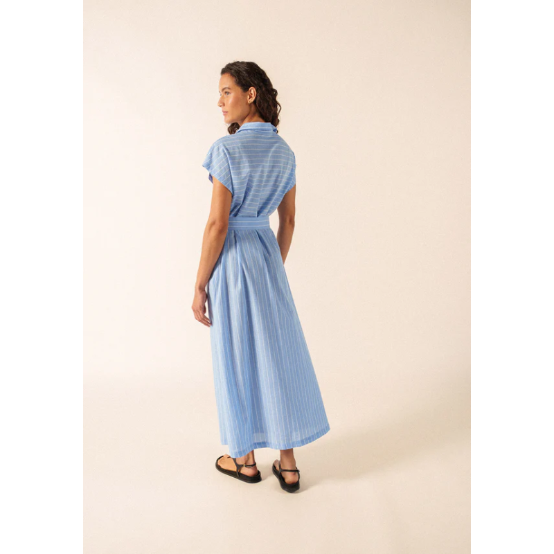 Quand la chaleur de fin de journée s’adoucit, la maxi dress boutonnée Maelys s’impose comme une pièce simple et élégante. Confectionnée en coton (100%) et en voile rayé, elle est particulièrement légère et suit le mouvement du corps avec fluidité.