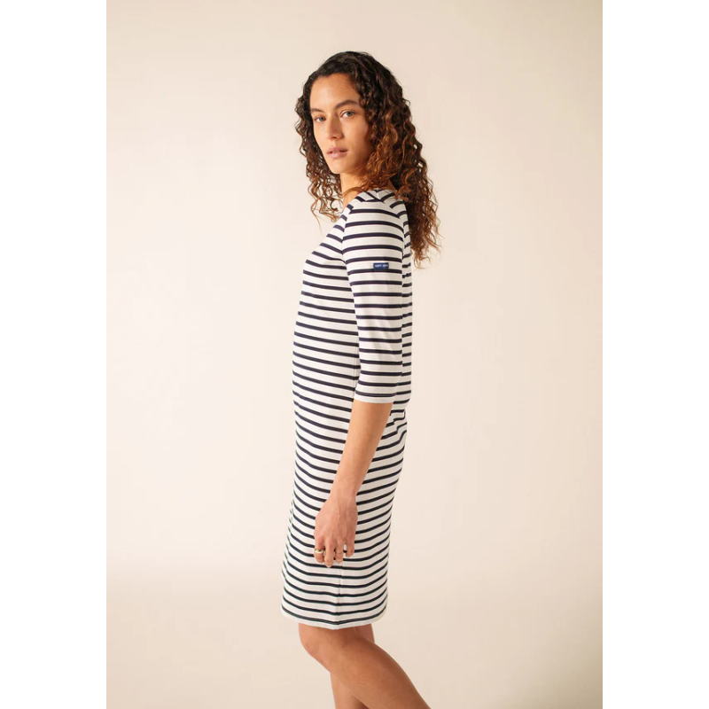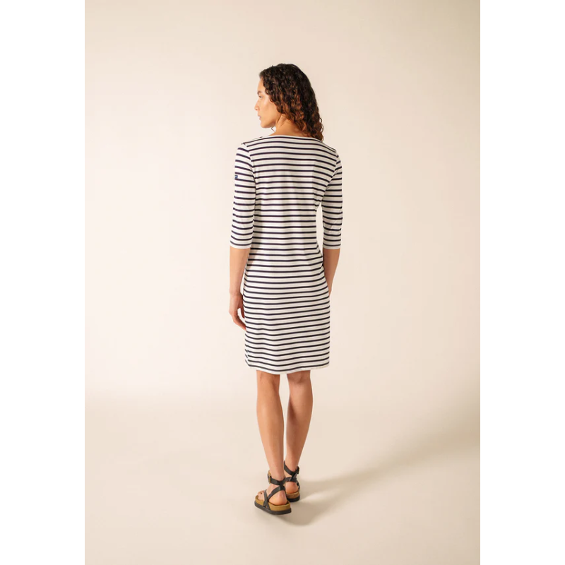 Incontournable de nos collections estivales, la robe en jersey Propriano est rayée et conçue dans une matière anti-UV, pour allier style et protection solaire. Sa coupe a été revue afin d’être plus confortable et moins près du corps. Avec un col rond élégant et des manches longues, cette robe en jersey est idéale pour les vacances. Fabriquée avec fibre recyclée, polyamide recyclé et elasthanne, elle offre confort et légèreté, sur une longueur moyenne qui complète parfaitement un look estival.