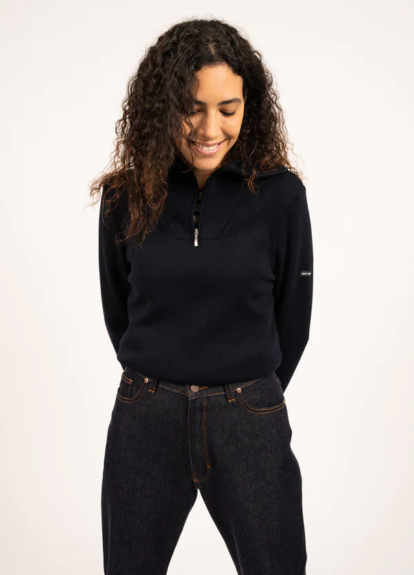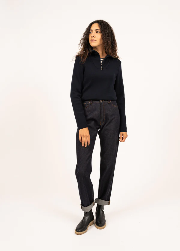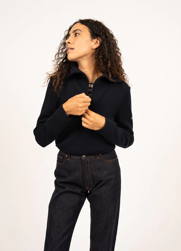 Avec son allure casual inspirée de l'univers workwear, le pull Passerelle est un incontournable de notre collection. Confectionné en laine dans nos Ateliers, il est chaud, confortable et durable. On aime son col camionneur, masculin, équilibré par sa coupe ajustée, féminine.