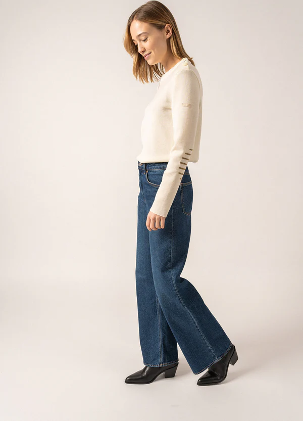 Inspiré de notre héritage marin, le pull en laine Brégançon est un incontournable du vestiaire SAINT JAMES. Tricoté dans nos Ateliers à Saint-James, sa coupe droite et sa composition 100% laine en font une pièce confortable, idéale pour celles cherchant un pull marin moins près du corps que notre traditionnel Marée. Ses coudières et son bouton en forme de marinière lui apportent une discrète touche d'originalité, pour un style marin revisité.