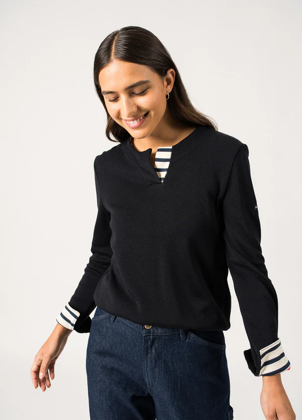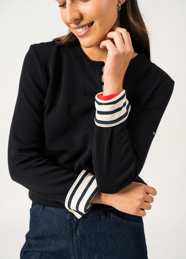 Le pull Quille incarne l’équilibre parfait entre élégance et confort. Confectionné en maille double-face, il révèle à l’extérieur la noblesse de la laine, tandis que l’intérieur en coton offre une douceur incomparable au contact de la peau. Une alliance subtile de matières, pensée pour celles qui exigent autant de style que de bien-être. Son col V délicatement dessiné est sublimé par un fini rayé en coton au niveau du col, détail discret mais sophistiqué, signature d’un vestiaire raffiné.