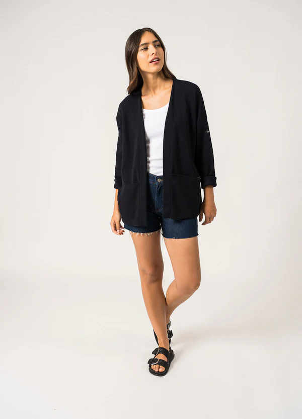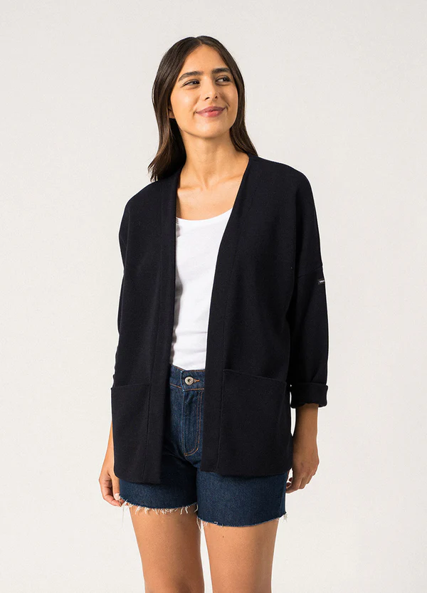 Avec sa coupe ample et son col châle, le gilet Hyères est un gilet élégant, à l'allure inspirée des kimonos. Tricoté dans nos Ateliers, il est fait dans la laine de notre iconique pull marin Marée, douce et naturellement thermorégulée.