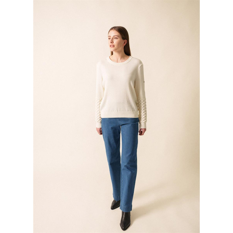 Pull jersey col rond à manches longues — coupe droite avec bords côte au corps et aux manches. Sa composition en laine (100 %), rehaussée du logo SAINT JAMES placé sur la manche gauche, incarne un style épuré et authentique.