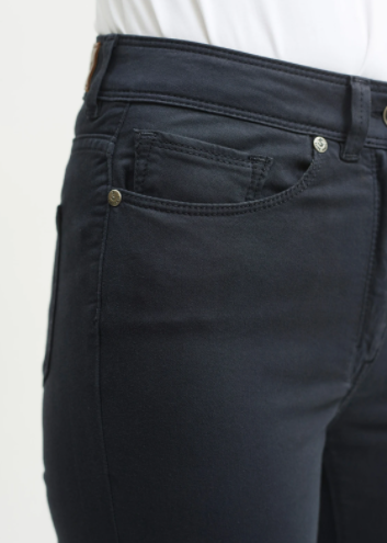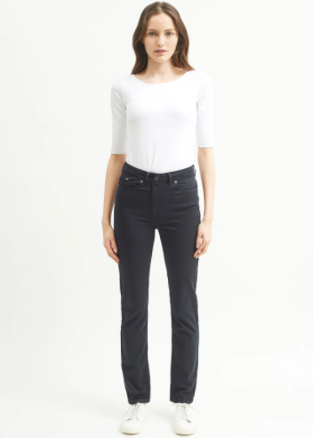 Pantalon 5 poches. Coupe ajustée, taille haute. Bouton métal avec une ancre gravée.