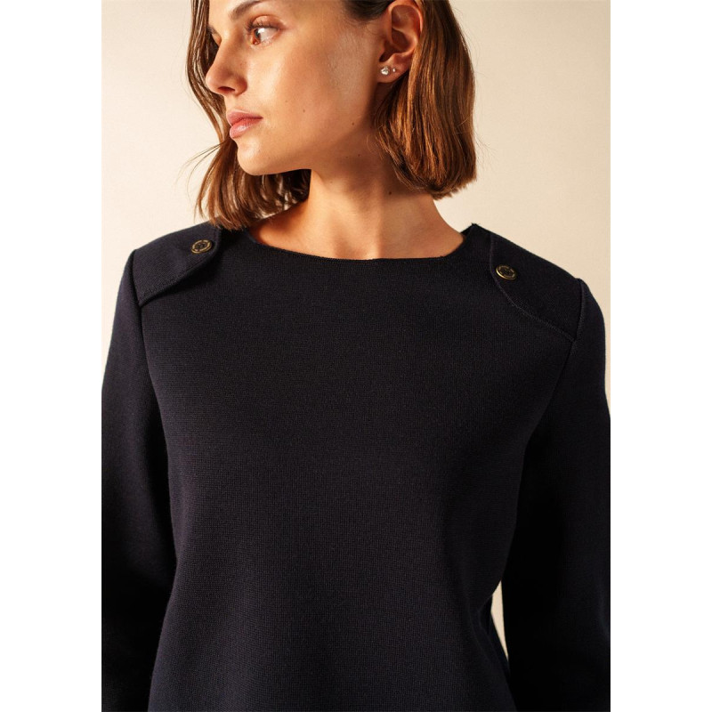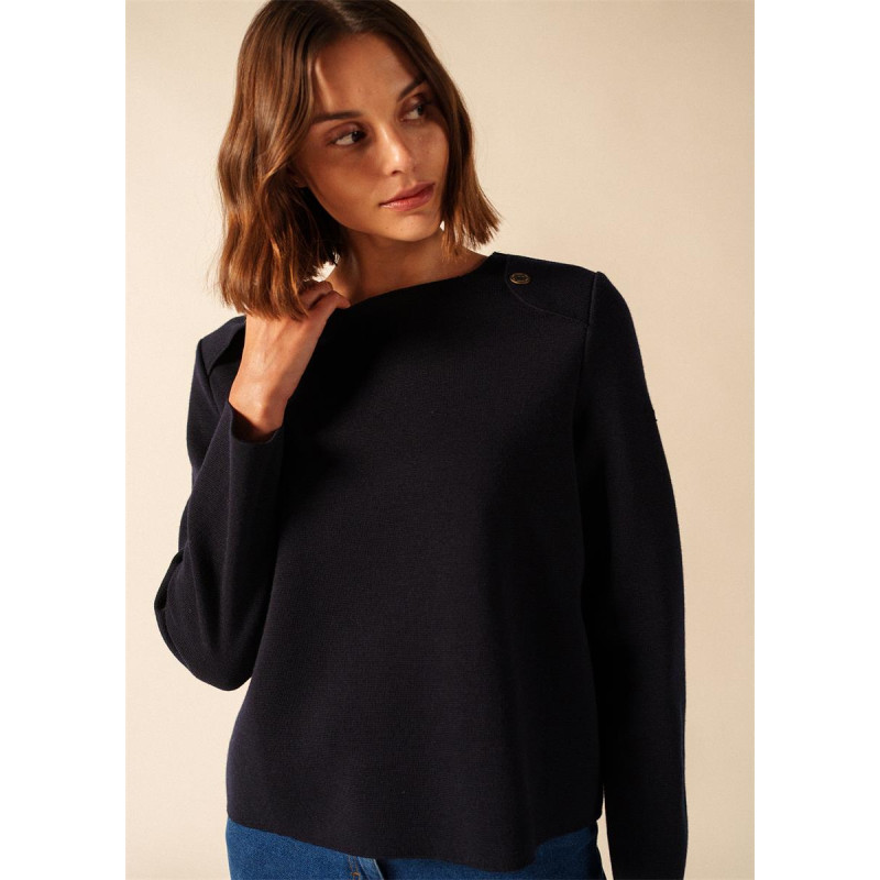 Ce pull, disponible en coloris navy, s'intègre parfaitement dans une garde-robe intemporelle et raffinée, offrant une polyvalence qui permet de le porter aussi bien en
