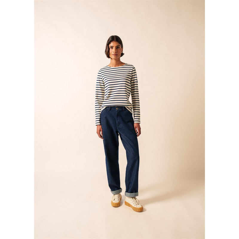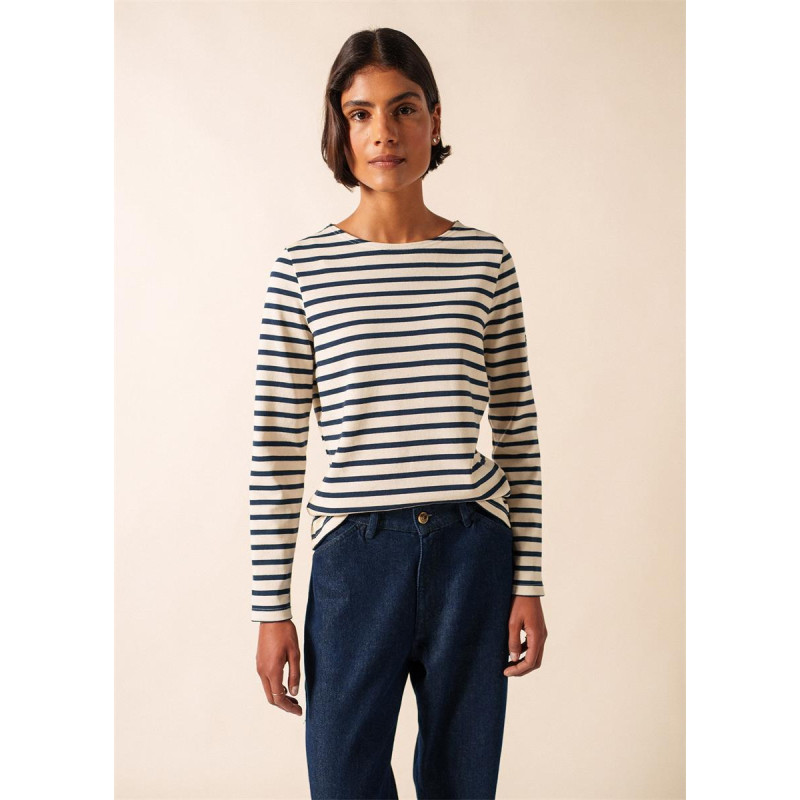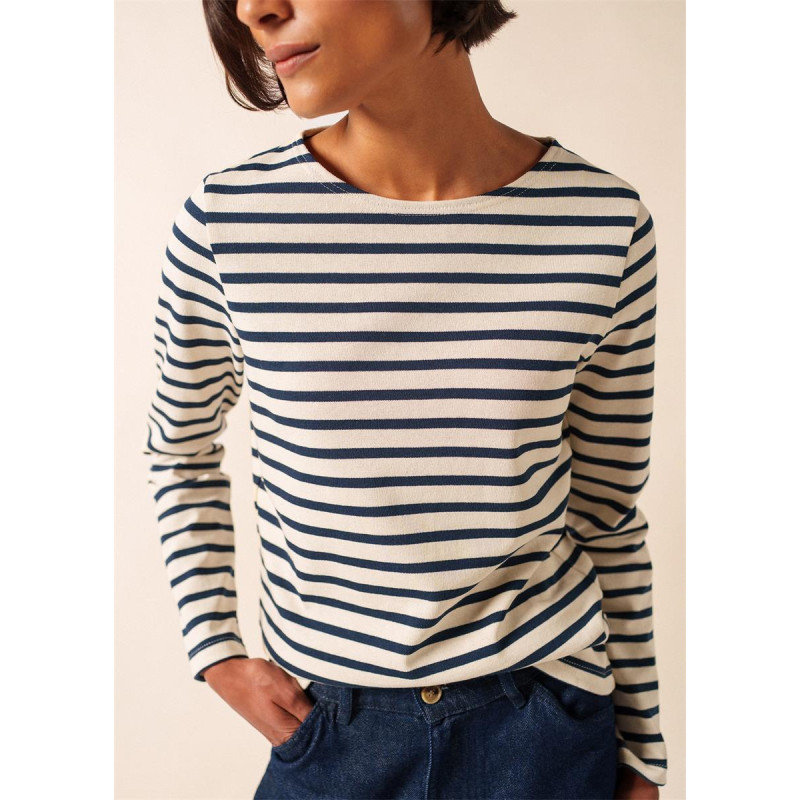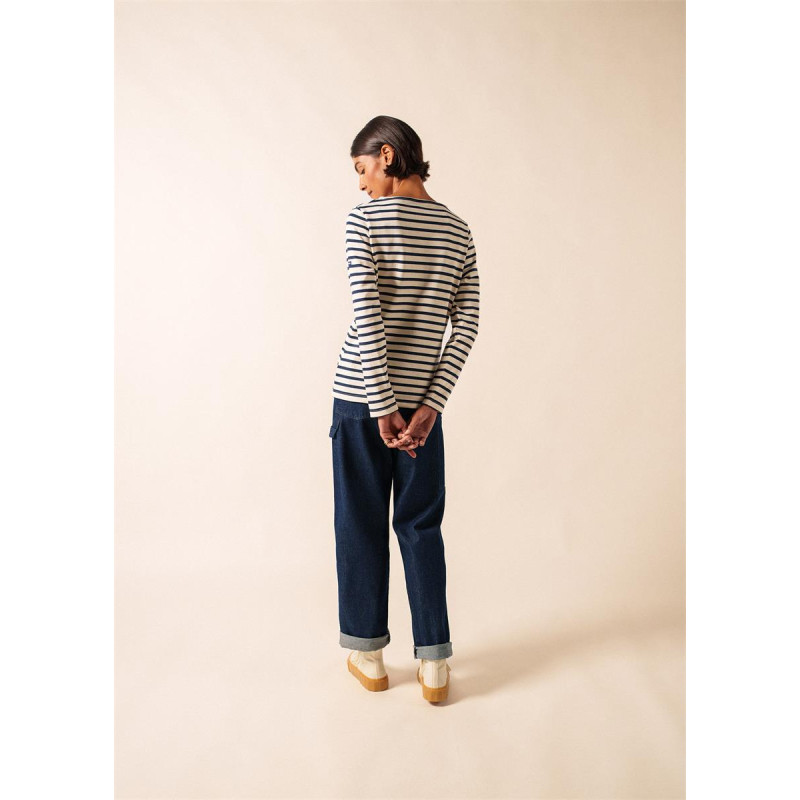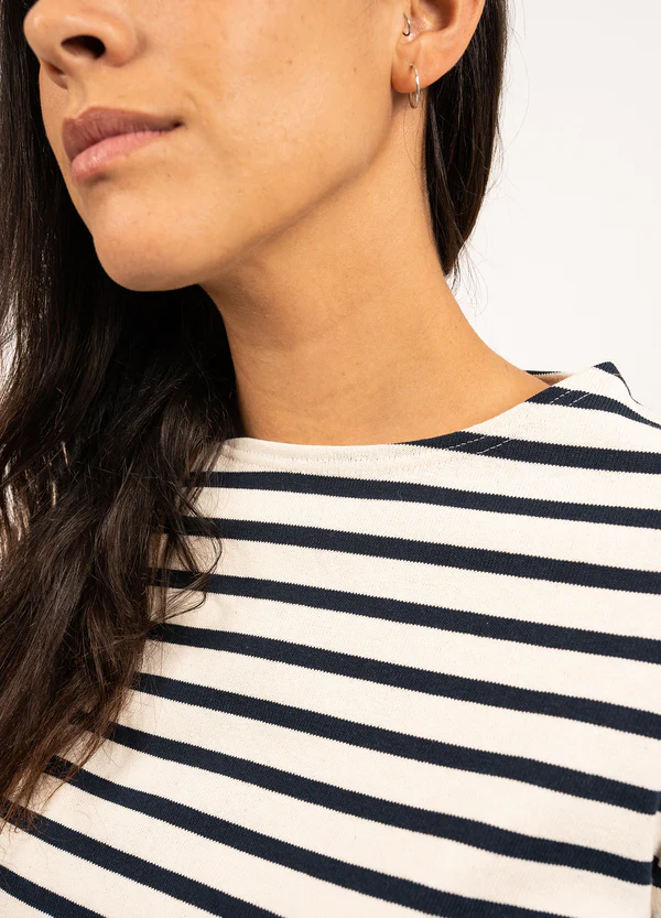 La marinière Méridame se distingue par sa matière authentique en coton cardé, qui lui donne un toucher rustique et une tenue plus épaisse que celle de notre incontournable Minquidame, en coton léger.