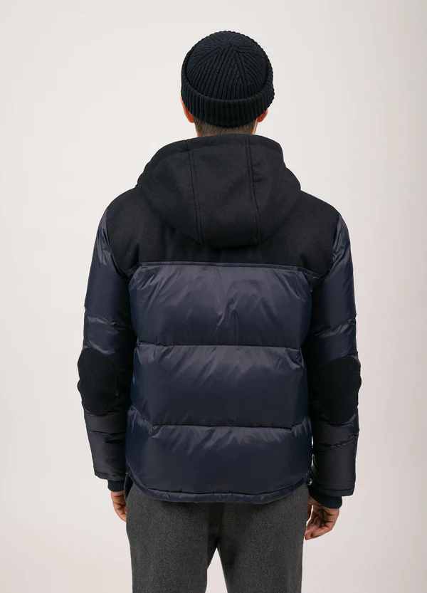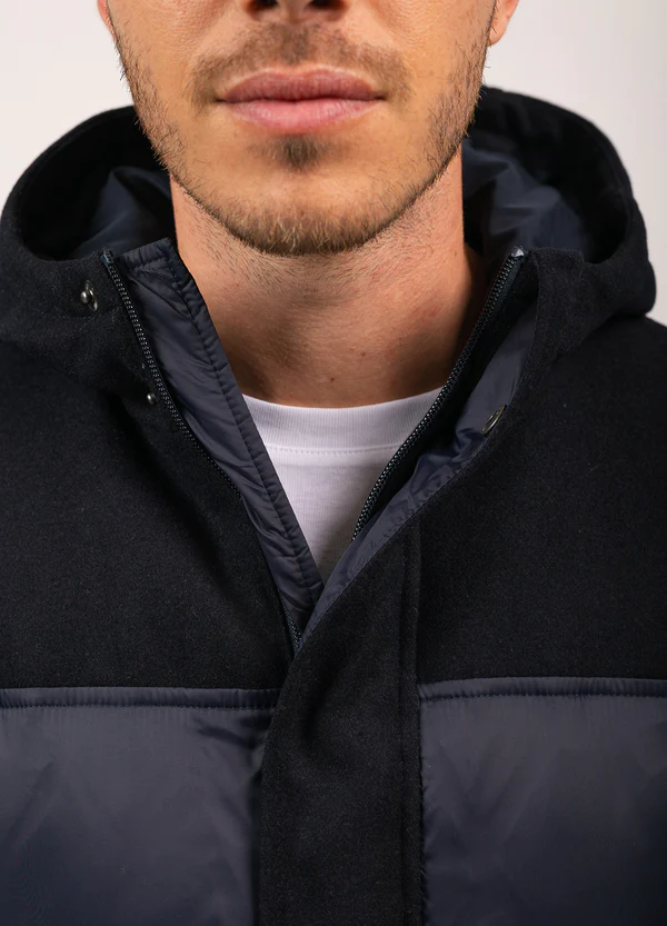 • - Empiècements en draps de laine : capuche, haut du corps, coudières, patte de boutonnage et poches