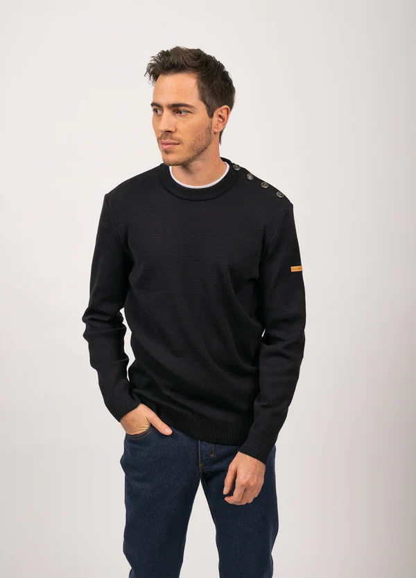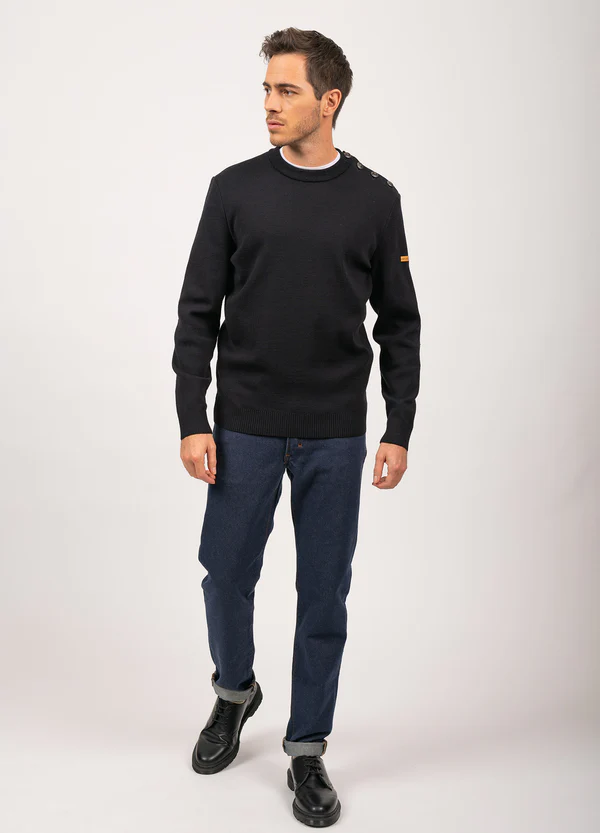 Issu de notre collaboration avec Atelier Tuffery, le pull Patrimoine célèbre le savoir-faire de nos deux maisons. Tricoté en laine Mérinos d'Arles, ce pull d'inspiration marin reprend certains codes de nos modèles iconiques : un col rond, un tricotage en côte 1x1, et un boutonnage épaule. Sur les manches, des coudières en toile indigo/chanvre rappellent le savoir-faire d'Atelier Tuffery.