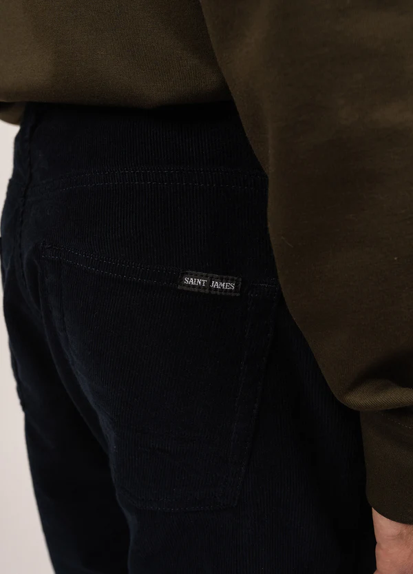 Pantalon 5 poches en velours. Poches arrondies devant avec une poche ticket côté droit et poches plaquées au dos. Braguette zippée. Fit droit.