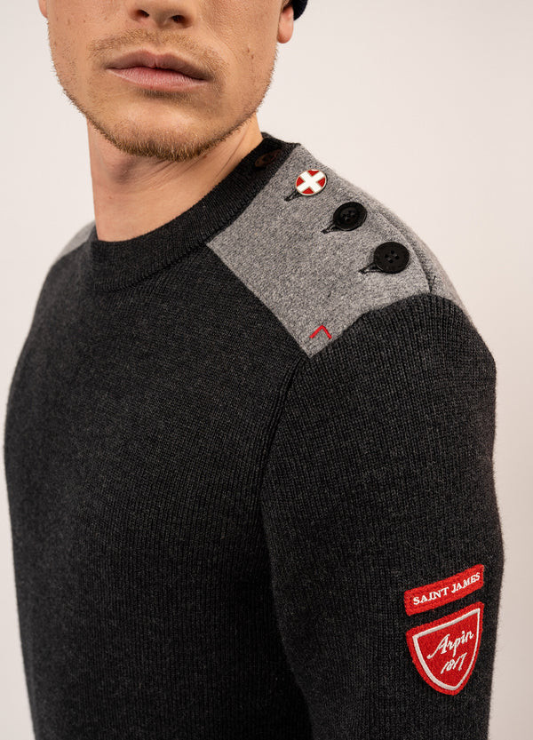 Le Moraine Arpin est un pull en laine inspiré du design de nos pulls traditionnels. le relief apporté par ses coudières et empiècements épaule en toile de laine Arpin, ainsi que son col rond remaillé et son boutonnage épaule.