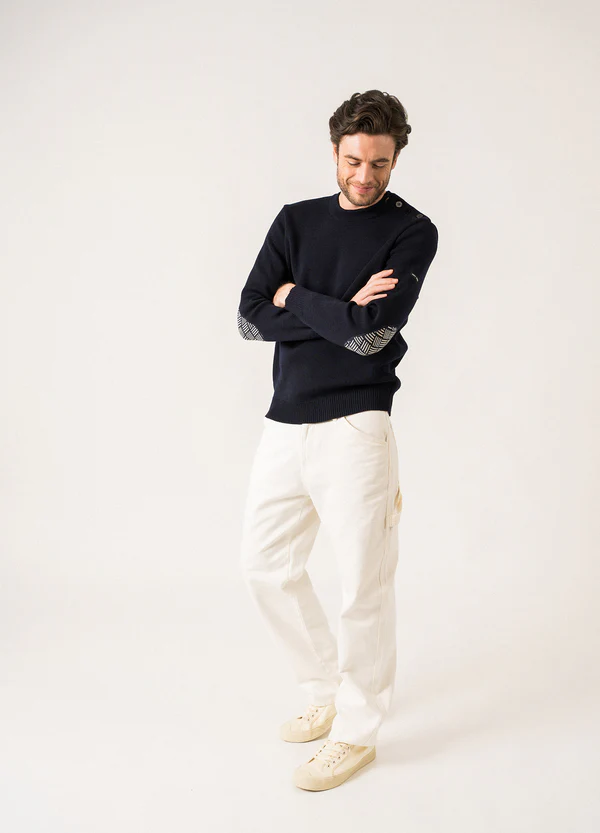 Avec son bord-côte en bas de corps, il garantit confort et volume. Le col arbore des boutons qui font écho à son origine : le chandail marin. Les coudières tricotées, quant à elles, illustrent notre expertise : un motif tricoté directement dans la manche, élaboré par nos programmeurs et perfectionné par nos raccoutreuses pour un résultat impeccable, inspiré des bobines de laine, symbole de SAINT JAMES.