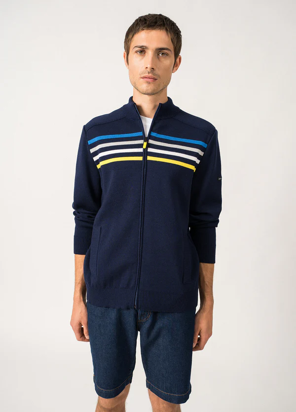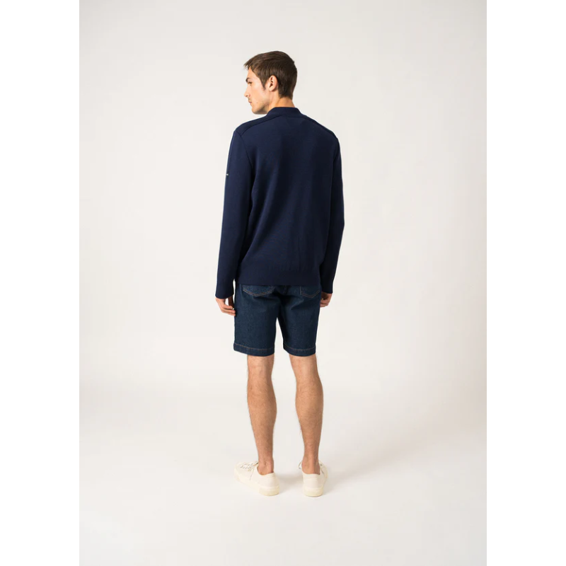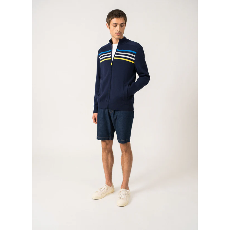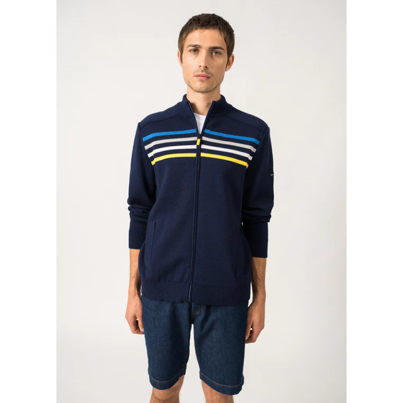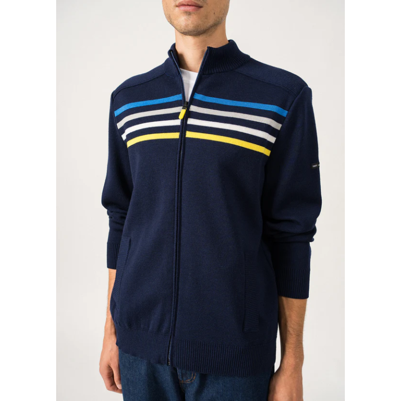 Le Bandol est un gilet zippé au style affirmé, imaginé et confectionné dans nos Ateliers normands. Tricoté en point de Rome, il allie résistance et élégance. Son design se distingue par ses rayures placées sur la poitrine, qui apportent du contraste au bleu marine profond de la pièce. On retrouve aussi des détails contrastés soignés, comme la tirette de zip et le logo SAINT JAMES sur la manche gauche, pour une touche graphique discrète mais marquée.