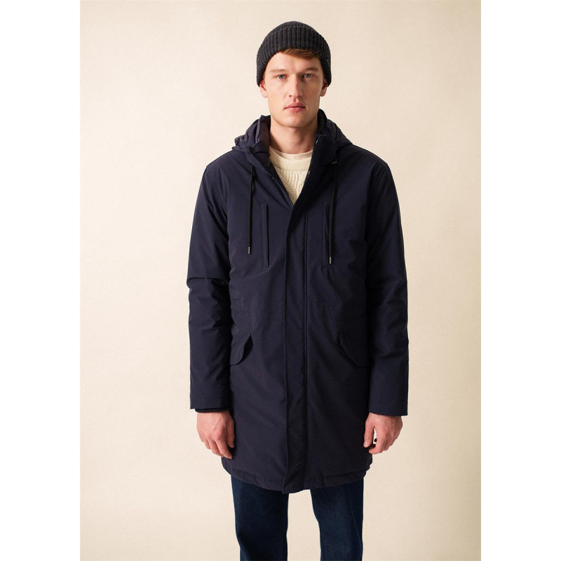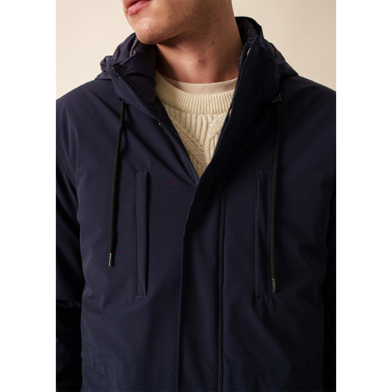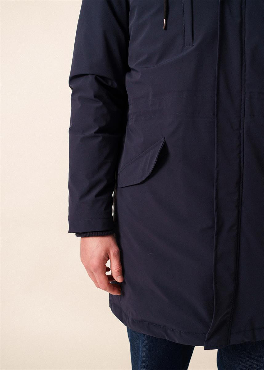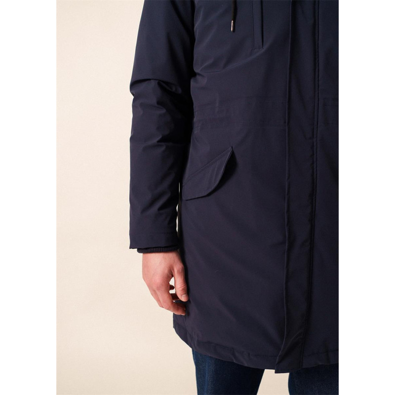 Cette parka longue en toile est conçue avec un col montant et des manches longues pour une protection optimale. Ses coutures étanches assurent une imperméabilité efficace, tandis que la capuche avec fermeture zippée sous patte offre une praticité supplémentaire. Elle est dotée de boutons pression, de poches poitrine à rabat et de poches intérieures zippées pour un rangement sécurisé. Sa coupe droite garantit une silhouette élégante, et sa composition en polyamide (87%) et élasthanne (13%) apporte confort et souplesse.