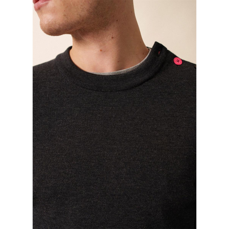 Ce pull à col rond mise sur une coupe classique relevée par des finitions travaillées. Tricoté en côte 1x1, il structure la silhouette tout en souplesse. Sa patte de boutonnage épaule ornée de boutons ton/ton, dont un contrasté, lui apporte un détail discret mais distinctif. Les contrastes à l’intérieur de l’encolure et au bas des manches renforcent son caractère, tandis que les bords côtes — au col, aux poignets et à la taille — assurent un maintien impeccable. Le logo appliqué sur la manche gauche signe discrètement la pièce.