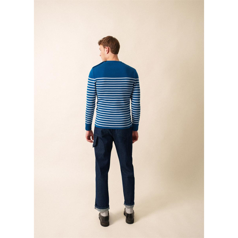 Classique du vestiaire marin, ce pull marin se distingue par son tricot en côte 1x1 et son col rond remaillé, qui lui confèrent une allure à la fois authentique et soignée. Son boutonnage sur une épaule facilite l’enfilage tout en ajoutant une touche traditionnelle. Sa coupe ajustée épouse la silhouette sans la contraindre, tandis que les bords-côtes en bas de manche assurent une tenue impeccable. Confectionné en laine (100%), il garantit chaleur et confort tout au long de la saison.