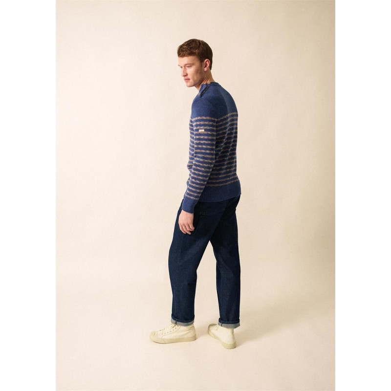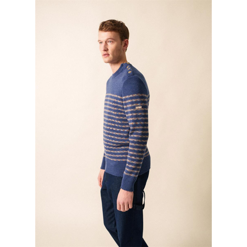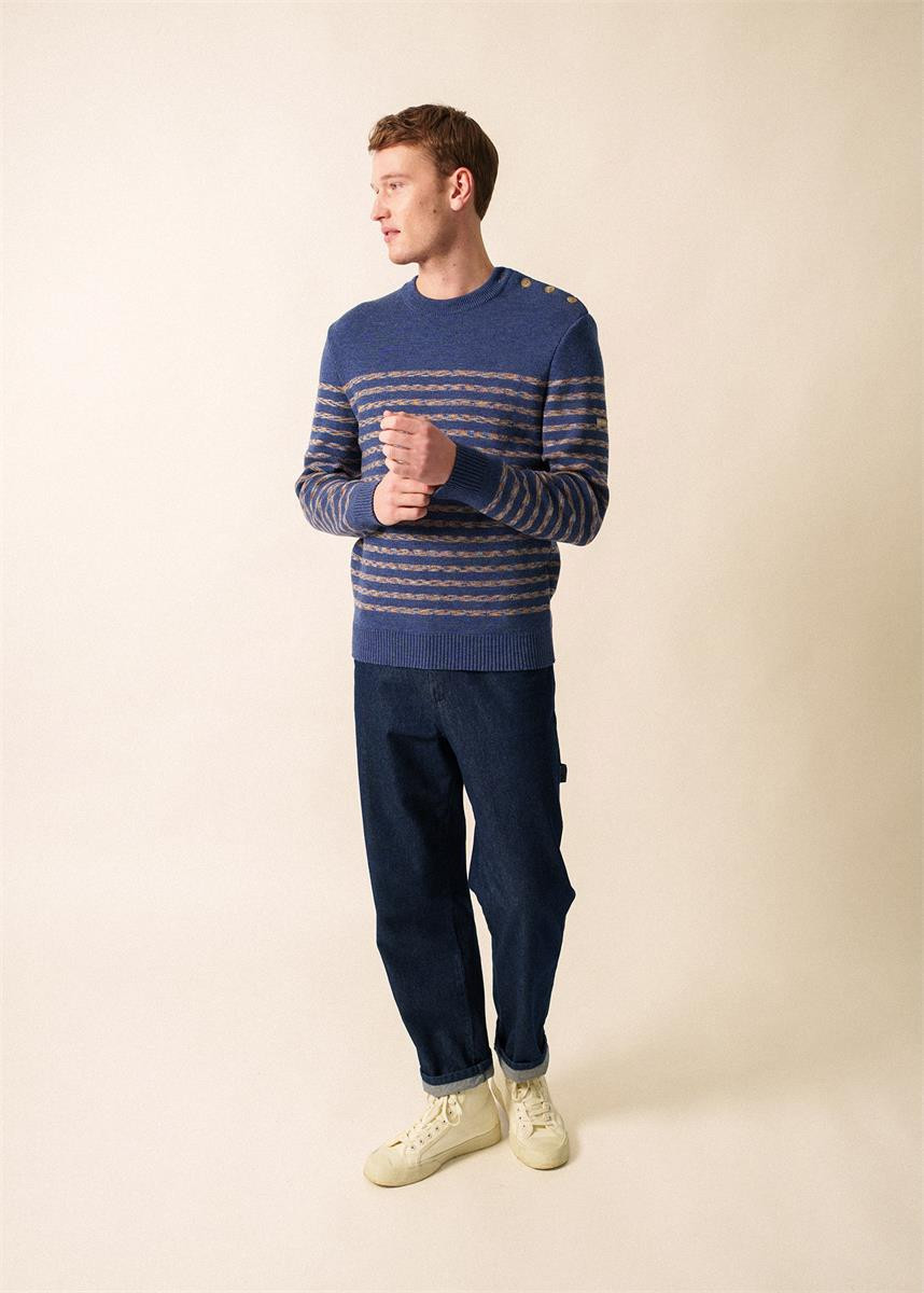 Ce pull marin en laine 100 % incarne à merveille le savoir-faire traditionnel et l’élégance naturelle du style marin.