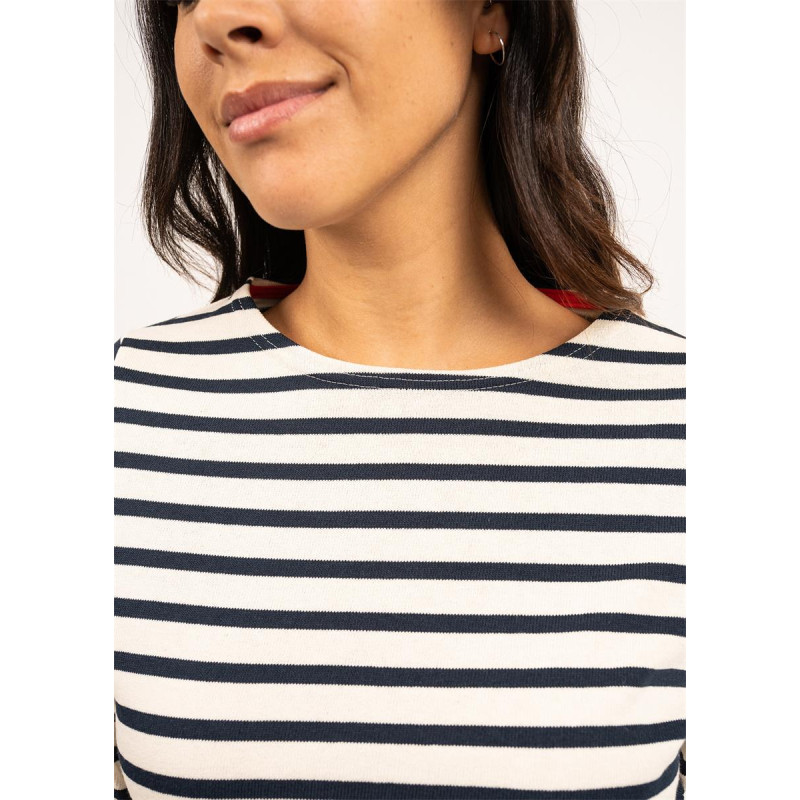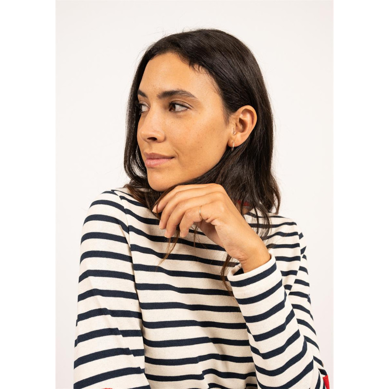 Elle reprend le col marinière classique, modernisé par des touches de rouge en contraste à l’intérieur du col et au bas des manches.