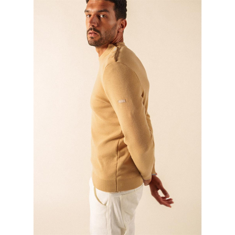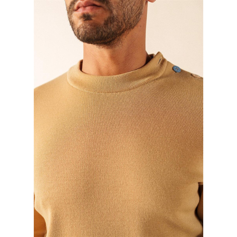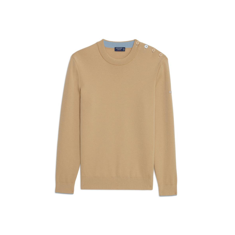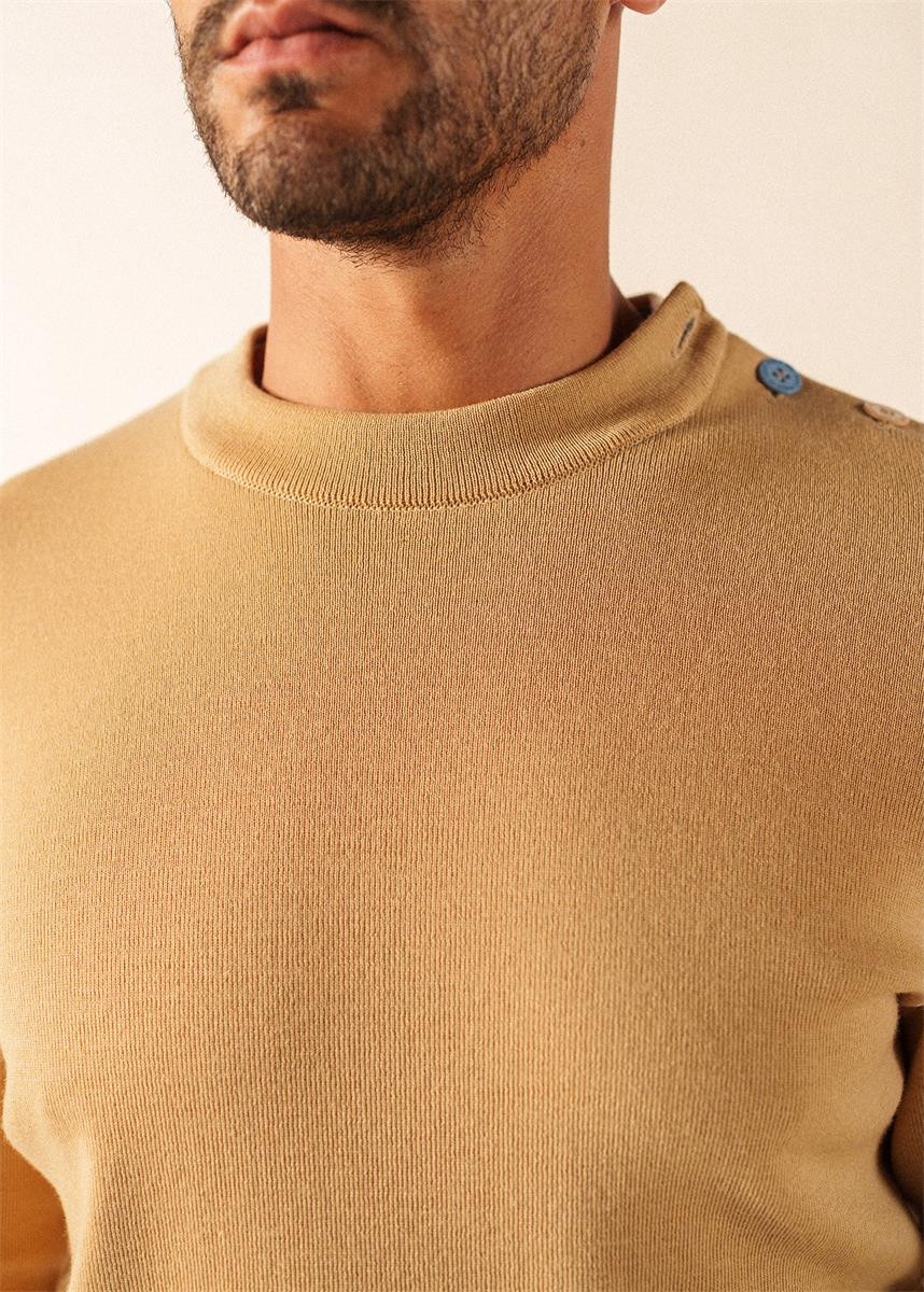 à l’épaule, détail emblématique du pull marin facilitant l’enfilage tout en apportant une signature esthétique distinctive.