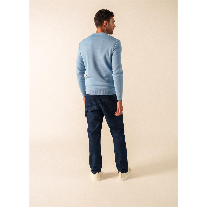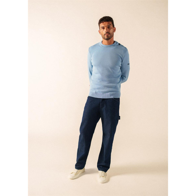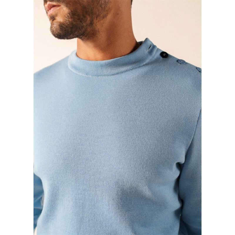 détail emblématique du pull marin facilitant l’enfilage et affirmant une signature esthétique distinctive.