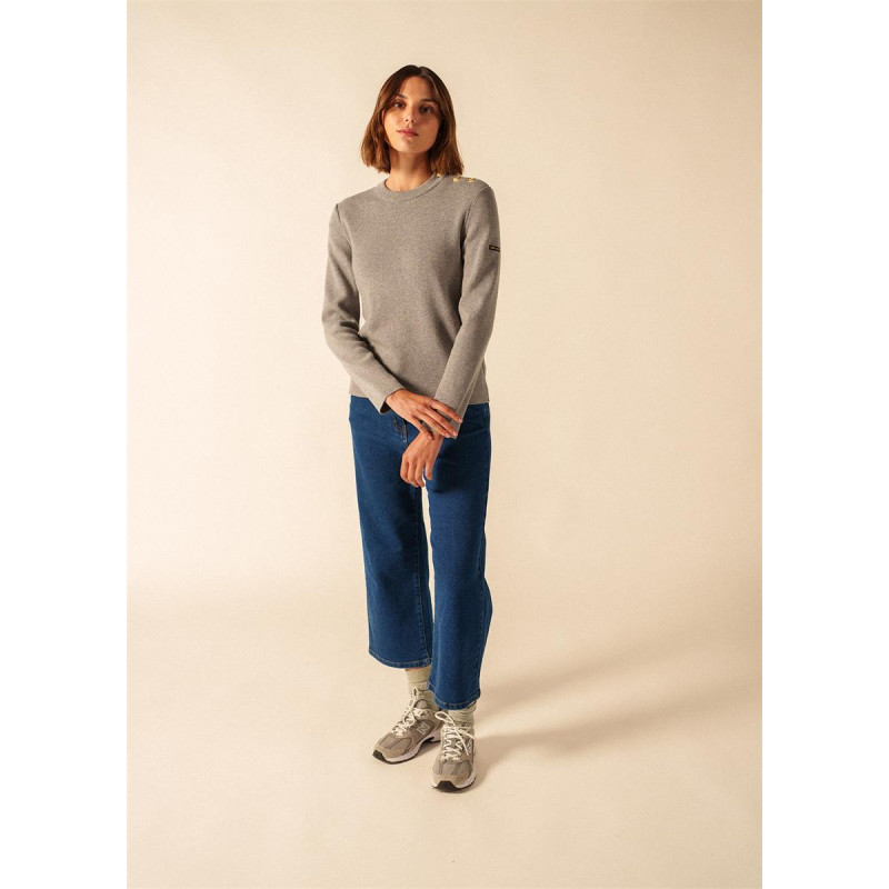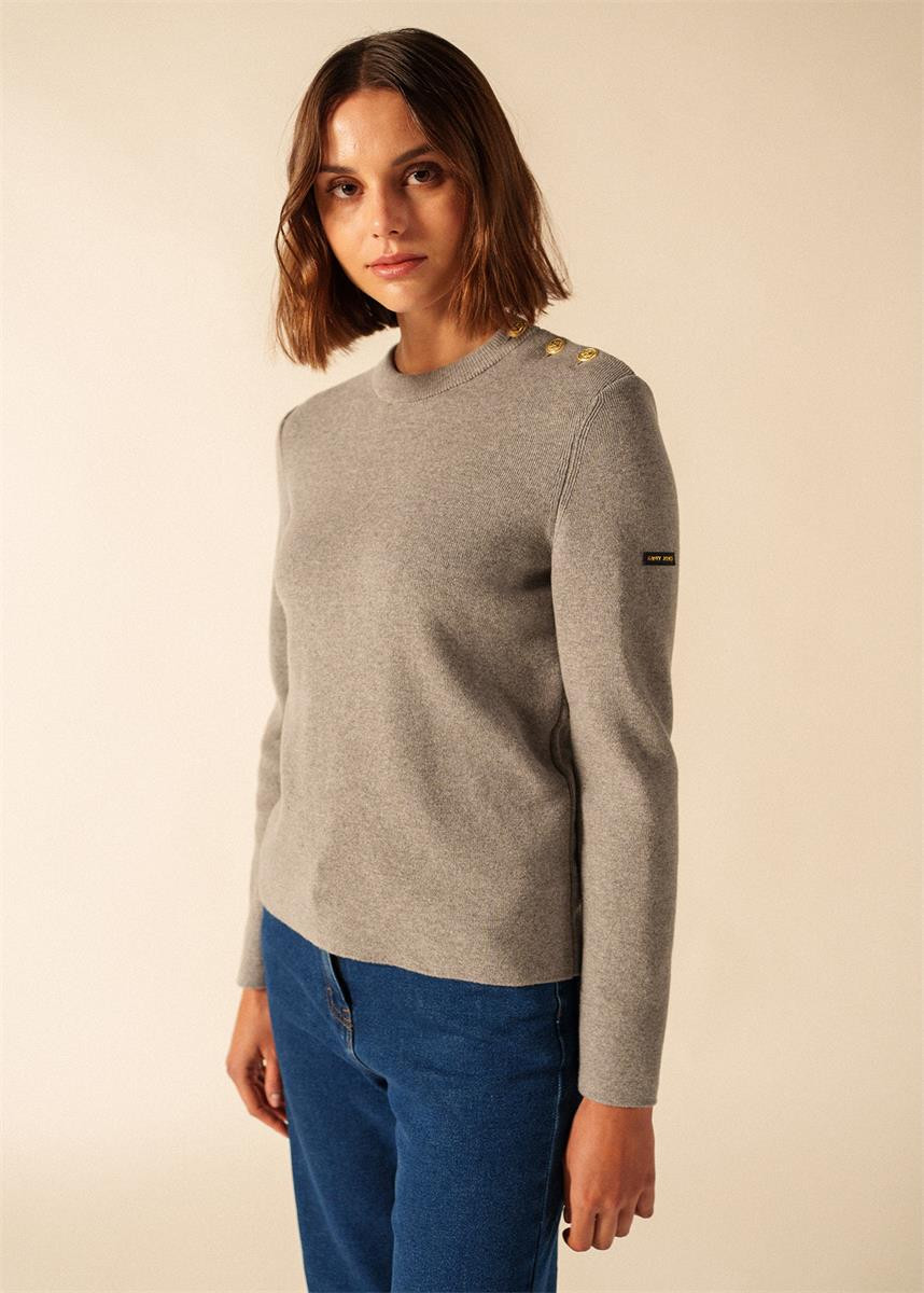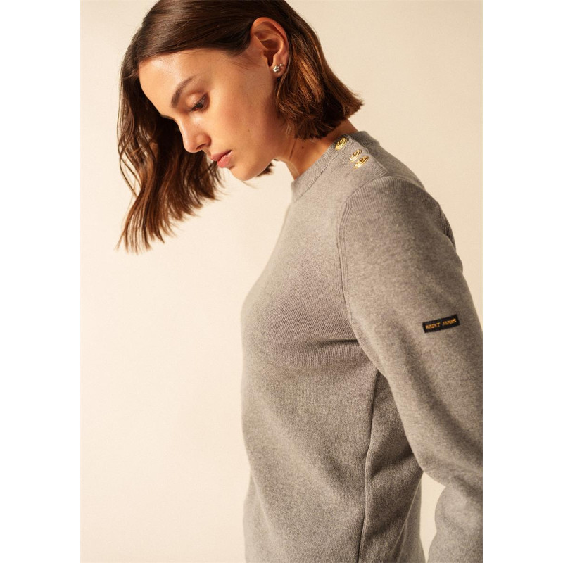 Détail signature : la patte boutonnée à l'épaule, ornée de boutons blason imitation corne, évoque l’univers marin cher à Saint James.