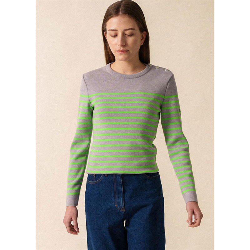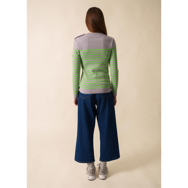 Le Pull marin rayé Marée Fluo est une pièce emblématique de la maison SAINT JAMES, alliant savoir-faire traditionnel et design contemporain.