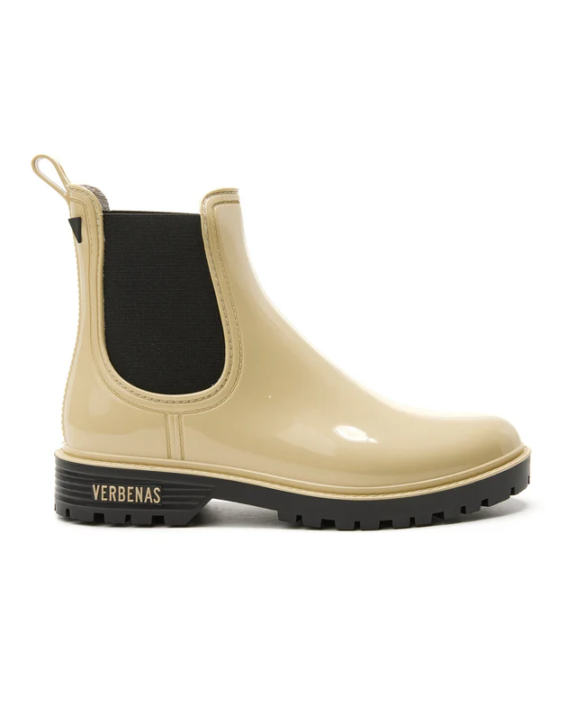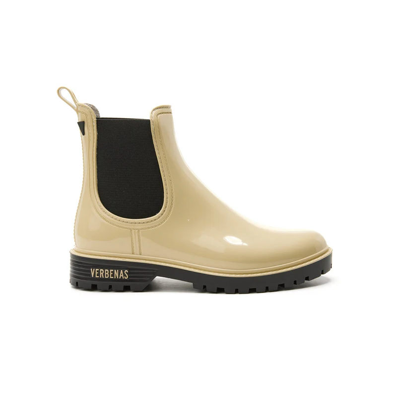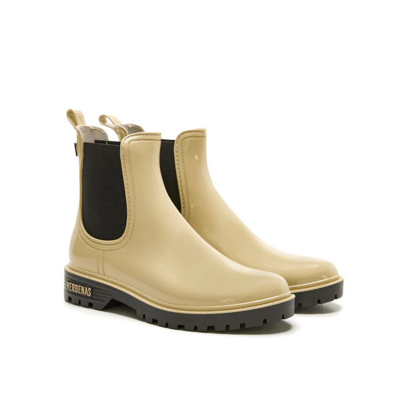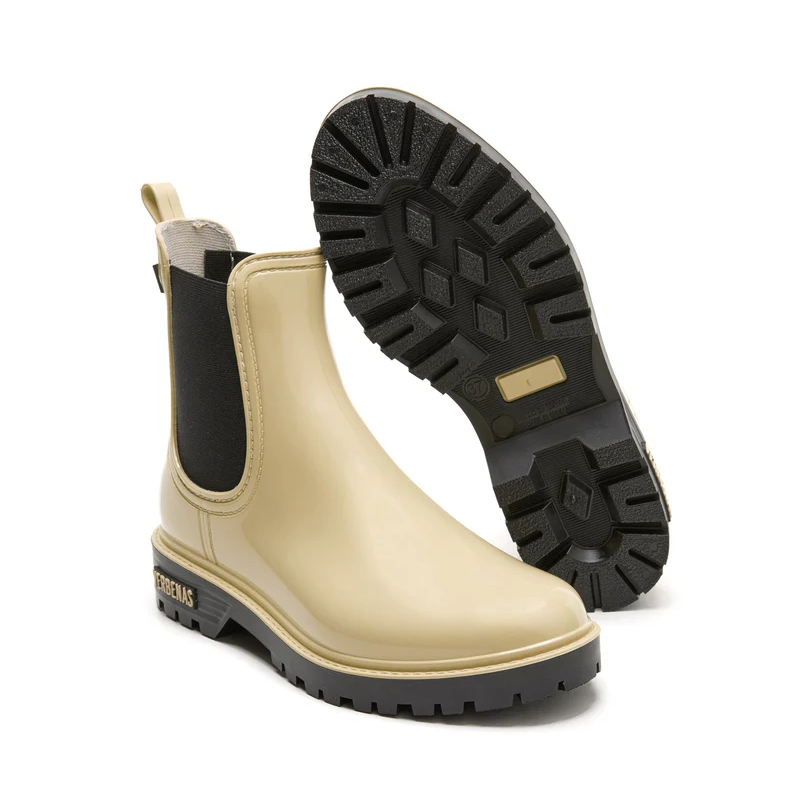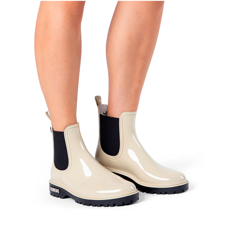 Les bottes de pluie Gaudí Brillo en écru attirent tous les regards avec leur effet brillant ultra chic. Inspirées de la forme classique des bottes Chelsea, elles apportent une touche urbaine et élégante, en écho à l’esprit des années 70.