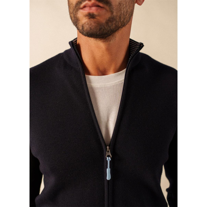 Doté d’un col montant zippé, ce cardigan iconique se distingue par ses rayures contrastées à l’intérieur du col, apportant une touche subtile de style contemporain.